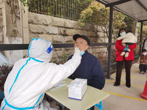 我们被分成多个小组,分别到不同的村组。大慨八点半,我们准时带着医疗物资到达了村民集中采集点。村部原计划在室内采集,考虑到疫情防控不能让人员在密闭的环境内长期聚集,我建议选在有遮雨棚的村民院子内进行露天采集,村民们能从正门进入,采集完后从我身边的侧门直接出去,循环性非常好,村部的同志们立即采纳了我的建议。村民们全程佩戴口罩,保持一米距离,我们迅速有序地安排好采集用物,给村民介绍配合流程,穿好防护服便严格按照防疫流程依规采集。下午我们组还去了跳马镇养老院,上门给老人们采集核酸。