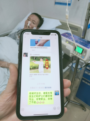 看着丈夫一天天好转,刘阿姨心里无比高兴,她将医护人员的辛苦记在心里,在5.20这天,买来鲜花,自己插好,配上花瓶,送到了医护人员手里。“5.20并不是年轻人的花前月下,它是呼唤全社会的爱,呼唤大爱,我今天代表所有患者和陪护家属,给医生护士送上我们的感谢和感激,希望鲜花能带给你们愉悦和一丝轻松。”捧着刘阿姨送的鲜花,医护人员心里都暖暖的,5.20确实是一个有意义的日子,医护人员的爱与患者的爱,就像一条小溪,无声的流淌,却又默默的将爱传递,大家都祝福这对相濡以沫的夫妻共同战胜病魔,早日康复回家!