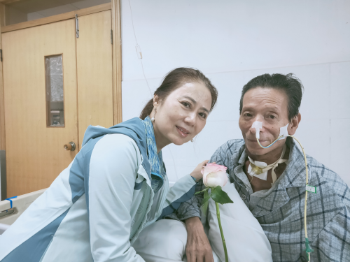 “史叔叔今年67岁,今年2月份确诊为喉咽恶性肿瘤、肺结核,在外院确诊后于3月转到肿瘤科行后续抗结核、抗感染、营养支持治疗,病情好转后再行局部放疗、免疫治疗。”据我院肿瘤科一病室肿瘤科主治医师谢益介绍,“患者入院时,在外院做了气管切开缓解呼吸困难,由于肿瘤的侵袭,体型消瘦,营养不良,体重仅80斤,无法站立,无法说话,也无法正常进食,整个人情绪十分低落。但是患者的爱人刘阿姨非常乐观,每天柔声细语,细心陪伴和照顾患者;为了给患者补充营养,想着法子将各种食物用料理机研磨成流质,再通过胃管注入;翻身、拍背、擦澡这些生活护理做起来比专业护工还专业,大家看在眼里,都非常感动。”