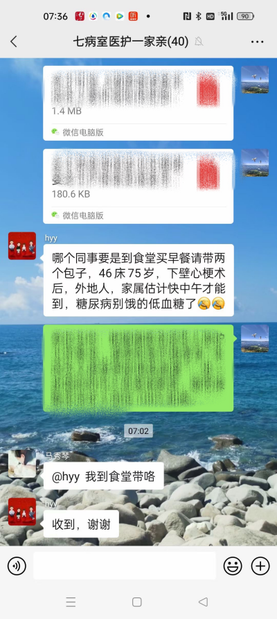 “哪位同事要是到食堂买早餐请带两个包子,46床75岁,下壁心梗术后,外地人,家属估计快中午才能到,糖尿病别饿得低血糖了……”8月31日早上7:00,在我院心血管内科“七病室医护一家亲”的微信群里,黄玉艳医生发出来这样一条信息,很快,护士马秀琴就在群里进行了回应,没多久,热乎乎的早餐就送到了刚做完心梗介入治疗的邓爱国(化名)老人手里。