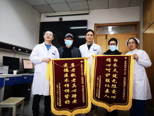 “谢谢你给我的爱……”11月17日上午九点,我院运动医疗、关节、骨病科病房里,100岁高龄的陈苏一(化名)老人握着科室主任丑克的手,用歌声表达着自己的感激和喜悦之情。原来,老人一个月前不慎摔伤后导致“左侧股骨粗隆间骨折”,辗转求医后,最后在我院接受了手术,今天是老人出院的日子,家人特意向医护人员送上了锦旗表达感激之情。