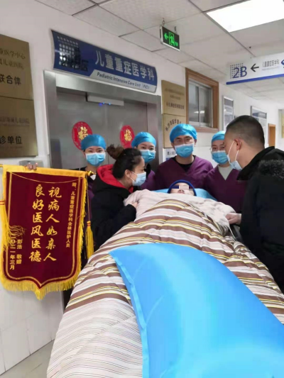 2022年11月20日上午,8岁患儿童童的父亲彭先生将一面印有“视病人如亲人,良好医风医德”的锦旗送到儿童重症监护室和神经外科医护人员手中,并由衷地感谢在他们在童童住院期间给予的精心治疗和细心呵护。而这也牵出了医患同心,帮助8岁男孩与病魔抗战100天的故事。