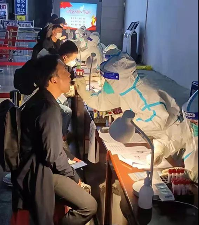 10月22日下午4点,小分队接到通知,晚上7点需派10人到高铁南站进行核酸采集工作。一部分刚完成核酸工作的同志刚返回酒店,又报名参加高铁南站的工作。吃完盒饭,尤鑫护士长带领10位队员又出发赶往高铁南站。