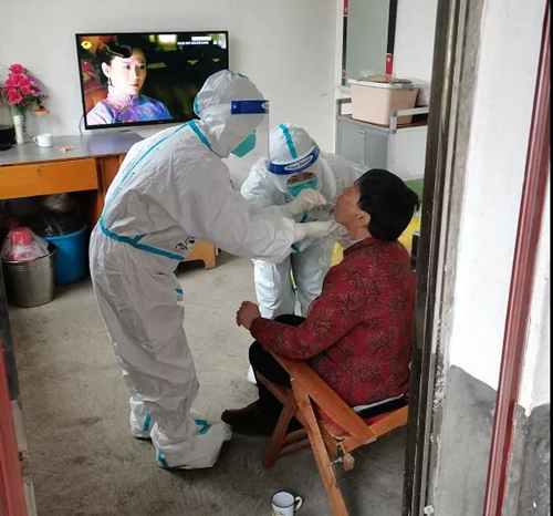原来老人前几天不慎摔伤了,家里只有一位80岁的老伴,正在发愁怎么配合完成核酸检测,工作人员的上门采集让他们老两口很感动。采集完后,老人热情的挽留大家吃了中饭再走,大家微笑着婉拒后,继续赶赴下一个采样地址。队员们踩着湿淋淋的泥地走过一家又一家,尽管饥肠辘辘,两腿仿佛灌了铅一样越来越走不动,但大家克服困难坚持走完了最后一户。