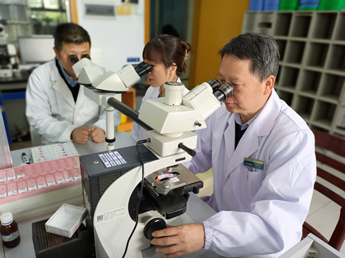 走进病理科诊断室,记者看到朱德茂正在多头显微镜下带领同事们进行疑难病理讨论。相连的办公桌上有十余台显微镜,一群身着白衣的医生正在紧张地忙碌着,有的正在显微镜下“精雕细琢”,有的正在认真审核每一份“疾病的判决书”,有的在互相讨论病例,场面紧张却又井然有序,可以看出病理科在朱德茂的带领下工作态度严谨,科室氛围和谐。