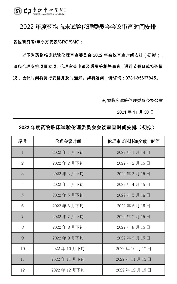 2022年度药物临床试验伦理委员会会议审查时间安排