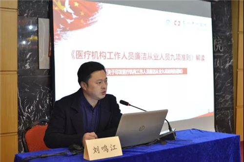 我院党委副书记、副院长刘鸣江详细解读了《医疗机构工作人员廉洁从业九项准则》,带领学员从制定背景、适用范围、主要内容和亮点等方面对《九项准则》进行了全面学习。
