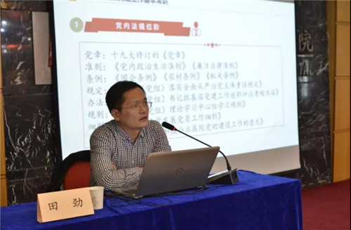 市委组织部组织指导处处长田劲讲授了《公立医院党建工作探讨》课程,从党建工作基本常识、党建工作形势和工作重点、支部基本建设、党建工作注意事项等方面细致讲解了医院基层党建工作。