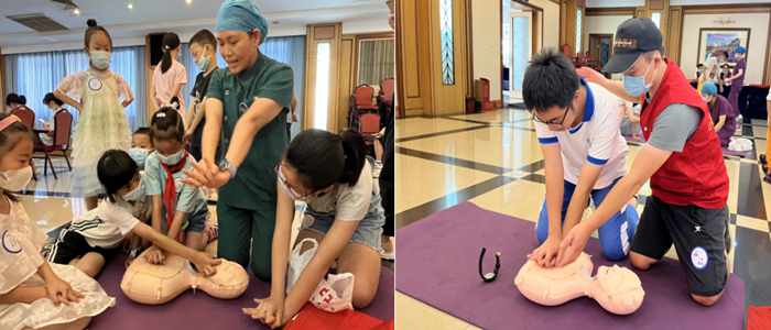 来自急诊医学科、儿科党支部,机关后勤急诊团支部志愿者分组,带领孩子们完成心肺复苏、海姆立克等实践培训。