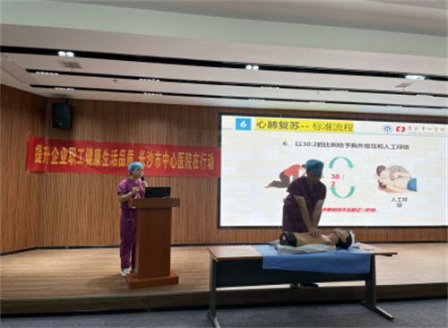 李玲还详细讲解了心肺复苏的基本步骤,以及开放气道、人工呼吸、胸外心脏按压的基本要点。刘松华配合李医师的讲解,现场示范操作要领。紧接着,麻醉手术党支部医务人员邀请职工参与演练。职工被分为四组,医务人员分组为职工们示范心肺复苏术动作要领,手把手指导操作步骤。