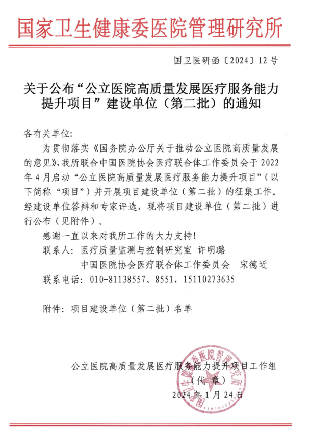 近日,国家卫生健康委员会医院管理研究所发布了《关于公布 “ 公立医院高质量发展医疗服务能力提升项目”建设单位 (第二批)的通知》(国卫函〔2024〕12号),长沙市中心医院获批国家“公立医院高质量发展医疗服务能力提升项目”建设单位,标志着医院高质量发展再上新台阶。
