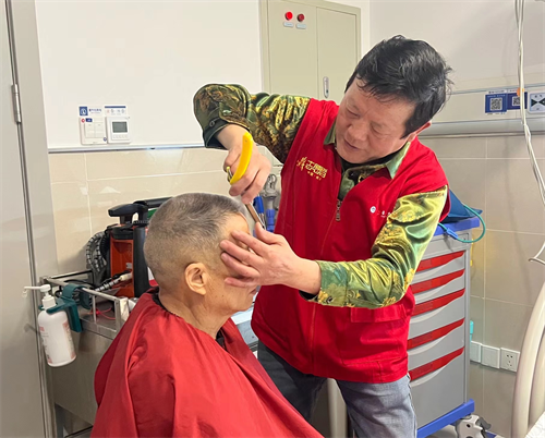 当日上午9时左右,义剪现场热闹非凡,住院患者、家属早早地在综合楼大厅等候。“叔叔阿姨,给你们理个干净利索的发型,清清爽爽过龙年……”志愿者娴熟地挥舞着手中的剪刀,根据理发者要求量身“定制”发型。细致的服务和精湛的技艺,赢来大家纷纷点赞。