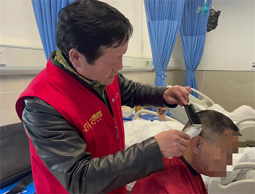 活动报名通知一发出,内分泌科党支部的龙浩护士长就提前向院团委进行预约,表示科室有患者行动不便,希望邀请志愿者到床旁进行义剪。51岁的孙大哥是一名糖尿病足患者,血糖升高6年,平时未引起重视,没有规范用药治疗,血糖高达20mmol/L,近1月来下肢麻木、左足大水泡未及时处理,出现溃疡感染,口服抗生素一周后未见明显好转,收治医院内分泌科住院治疗,经过科室系统处理,目前糖尿病足明显好转。“我出行不太方便,二月初二理发店肯定人多,爱心义剪真的办到了患者的心里头!”孙大哥感慨地说。