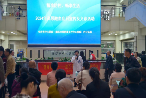 4月20日是世界高尿酸血症日,也称为世界痛风日。4月19日上午,长沙市中心医院(南华大学附属长沙中心医院)内分泌科在医院门诊大厅举办高尿酸血症科普讲座及义诊活动。讲座现场,内分泌科副主任医师黄碧向市民详细解读了高尿酸血症的成因、危害及预防措施。
