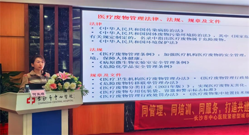 培训期间,我院医院感染管理部何亚琼主讲《医疗废物管理知识培训》。她讲解了医疗废物定义、管理法规及操作规范,明确了医疗机构在医疗废物管理方面的制度和要求,提高了参训人员的管理水平和安全意识。