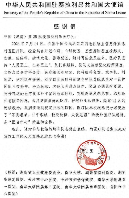 近日,我院收到一封来自我国驻塞拉利昂大使馆给第25批援塞医疗队发来的感谢信,特别提及医院急诊医学科主管护师李媛媛参与的一场跨国接力救援。