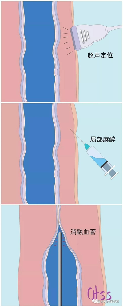 下肢浅表静脉曲张腔内射频消融治疗是一种通过热量使血管内膜受损,血栓形成及纤维化,最终达到管腔闭合的治疗目的。优势在于只需要局麻下手术、创伤小、无明显手术痕迹、术后恢复迅速、术后即可下床行走。与泡沫硬化剂和点式剥脱术配合使用效果更加。