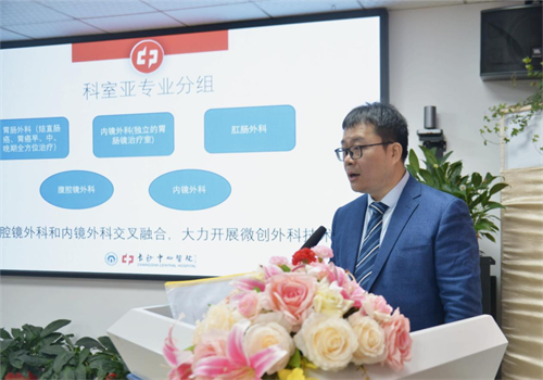普外科谢开汉主任致欢迎词,向质控中心介绍了普外科的现状及人员结构。普外科由胃肠外科、肝胆疝外科、乳腺甲状腺外科三个科室构成,其中胃肠外科是普外科一支非常重要的力量,谢主任对胃肠外科在疾病收治、新技术的规范开展等方面做出高要求。
